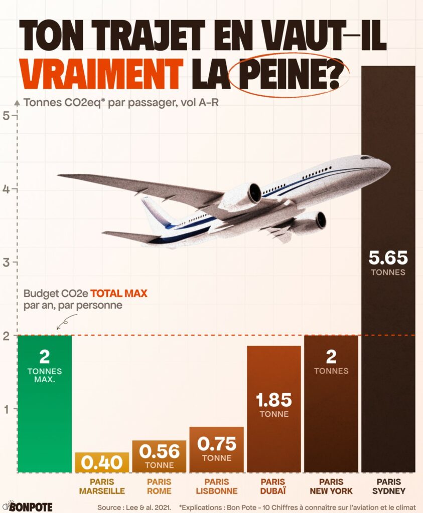 utiliser l’avion 2x par an pour un vol intercontinental -> 5T au moins