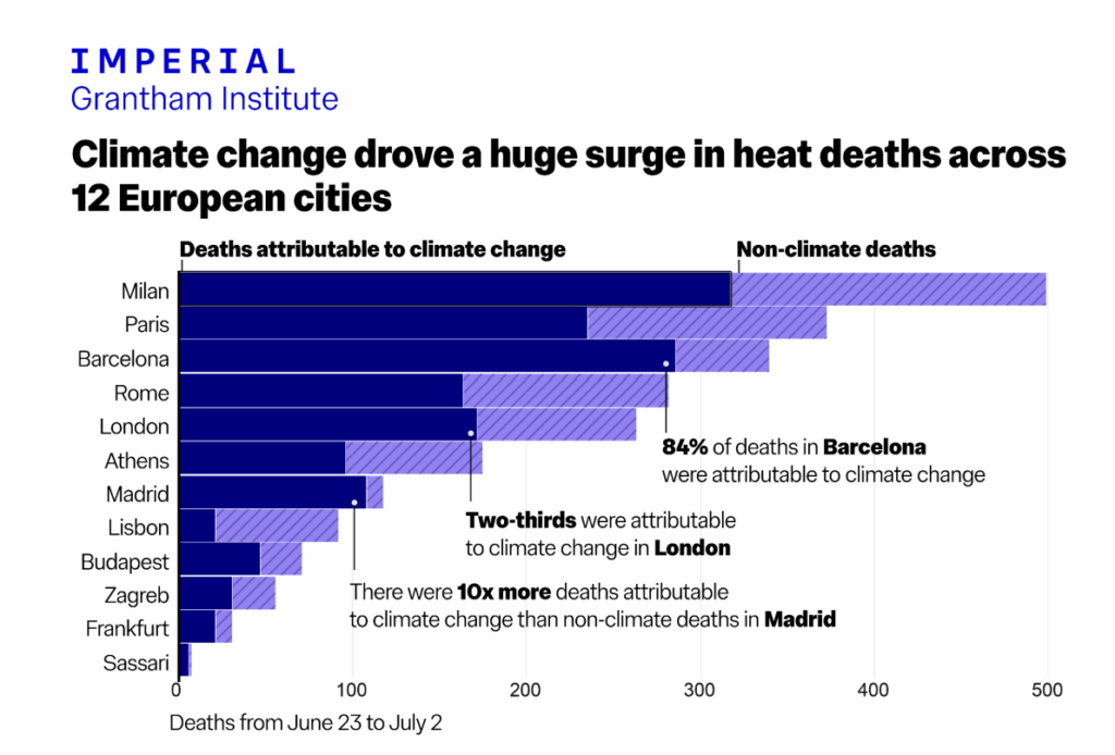 - Le changement climatique est à l’origine de 317 des décès par excès de chaleur estimés à Milan, 286 à Barcelone, 235 à Paris, 171 à Londres, 164 à Rome, 108 à Madrid, 96 à Athènes, 47 à Budapest, 31 à Zagreb, 21 à Francfort, 21 à Lisbonne et 6 à Sassari