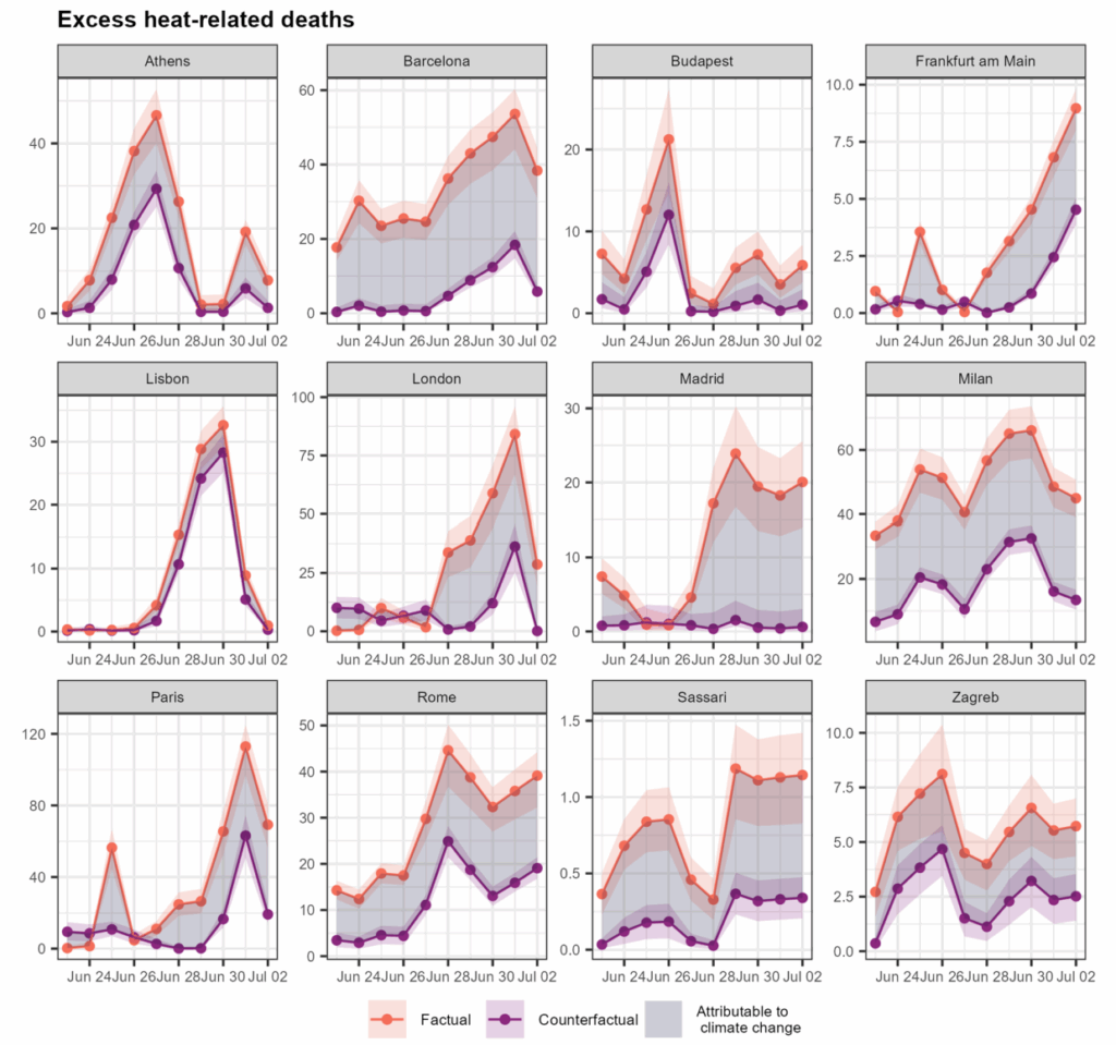 Sur la période du 23 juin au 2 juillet, le changement climatique aurait triplé le nombre de décès liés à la chaleur. La consommation d’énergies fossiles a augmenté les températures des vagues de chaleur jusqu’à 4°C dans les villes.