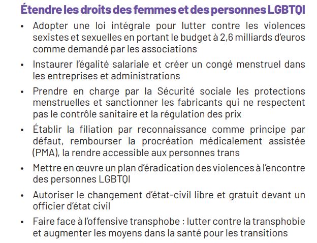 Contrairement au RN, le Nouveau Front Populaire, après avoir consulté plusieurs associations féministes, souhaite porter le budget pour lutter contre les violences sexistes et sexuelles à 2,6 milliards d’euros. L’ensemble des mesures pour les droits des femmes dans le programme sont ci-dessous :