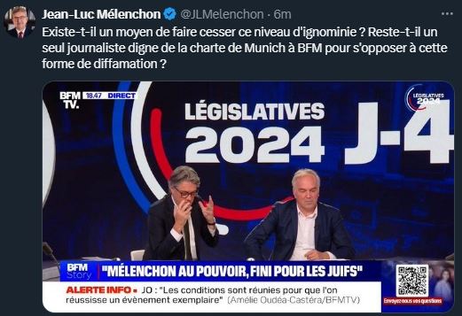 BFM TV n’est pas en reste. Le titre du bandeau ci-dessous est abominable : “Mélenchon au pouvoir, fini pour les juifs“.