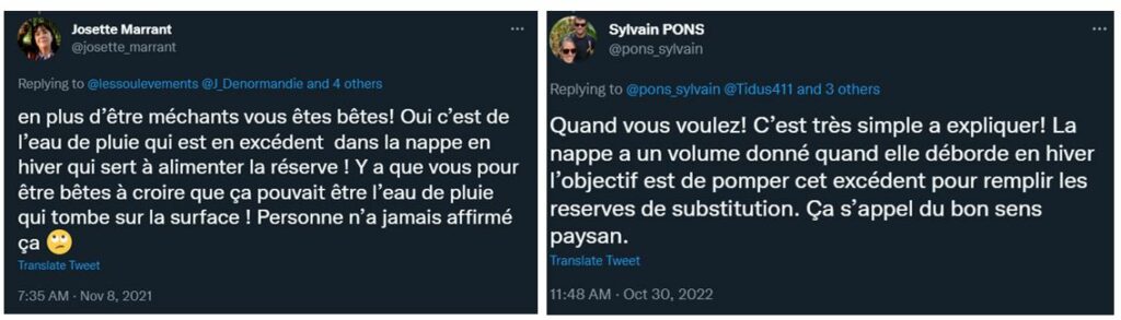 Il ne s’agit pas uniquement de remarques isolées sur quelques comptes Twitter, on entend des propos similaires lors des discussions sur le Plan Eau. Avec une petite subtilité néanmoins : on y parle d’eau en excès, de surplus. Ainsi, le ministre de l’agriculture déclarait en août 2022 “L’eau qui rentre dans les nappes c’est celle qui tombe tranquillement. Quand il tombe 100 mm en une demi-journée, cette eau-là file directement à la mer et ne vient pas remplir les nappes. Donc, il faut prélever les excès d’eau”.