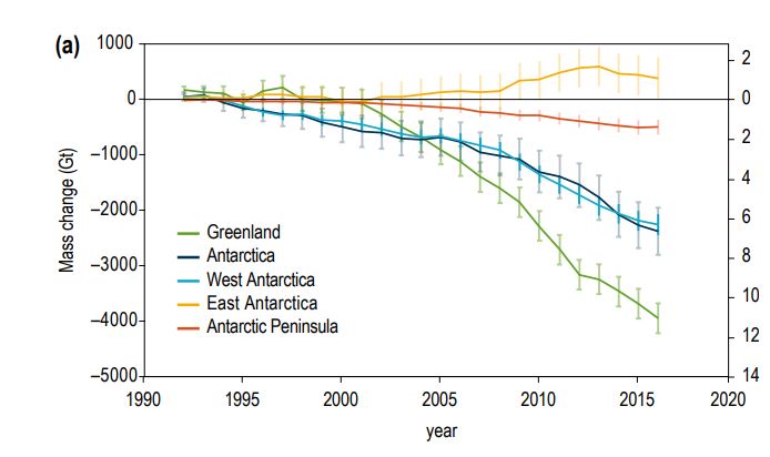 Depuis le rapport spécial sur la cryosphère du GIEC (SCROCC) et notre article sur les glaciers, le dernier rapport du GIEC a prolongé les estimations sur les 20 dernières années (grâce à l’altimétrie et la gravimétrie), en donnant notamment des séries de données sur la calotte glaciaire jusqu’en 2020 (TS.2.5).