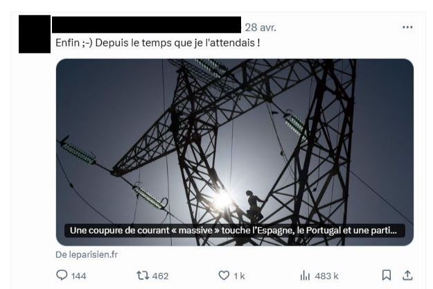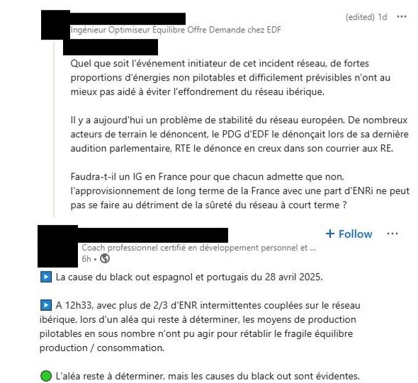 - Les réseaux sociaux s’en sont donnés à cœur joie sur ce qui peut être le coupable tout désigné : l’Europe via les interconnexions ou les énergies renouvelables. Même certaines chaînes de télévision, pourtant d’ordinaire respectables, se sont faites piéger par la nécessité de meubler et d’apporter rapidement des éléments.