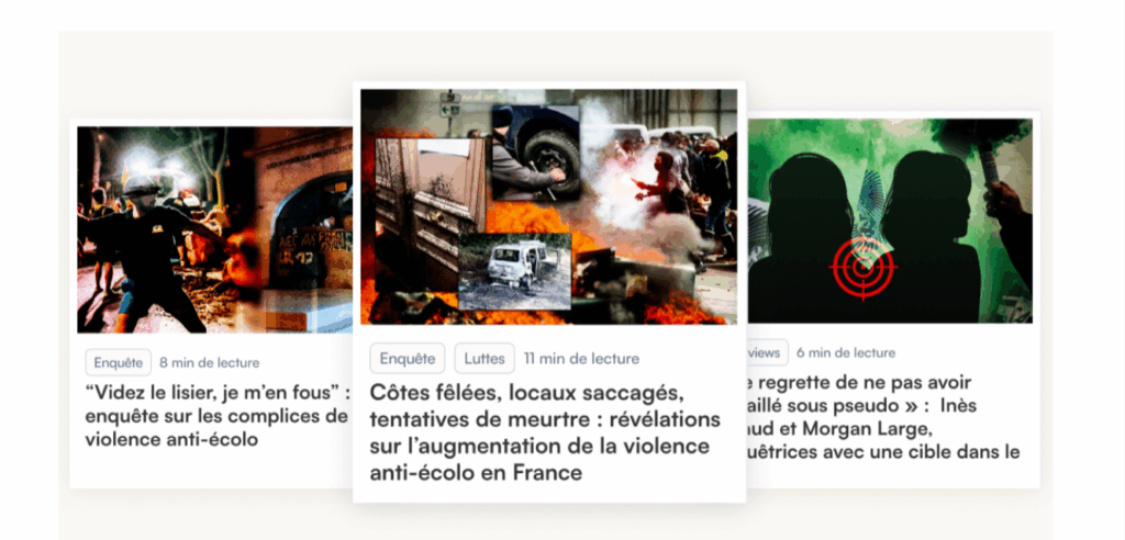 C’est aussi un vrai soulagement pour les vignettes. Ecrire un article est une chose, mais avoir une belle vignette (la photo que vous voyez avant de cliquer sur l’article), cela peut prendre plusieurs heures. C’est aujourd’hui beaucoup plus simple avec une équipe, et nous sommes plutôt fiers du résultat. Regardez par exemple notre enquête sur les violences anti-écolo avec les 3 vignettes du premier article, du second et du 3e de la série.