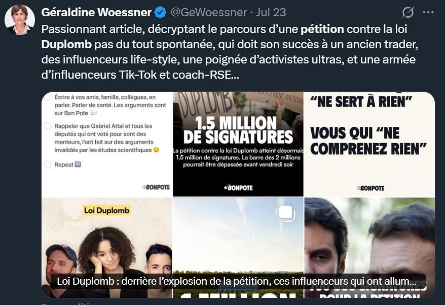 Le succès de cette pétition, qui mènera notamment à un débat à l’Assemblée nationale début janvier, ne doit pas faire oublier les méthodes du système, prêt à tout pour se défendre. Les mensonges répétés bien sûr, à l’instar de Laurent Duplomb sur France Info qui déroule des mensonges sans contradiction. Mais lorsque la pétition a explosé, ils ont cherché à diffamer l’initiatrice de la pétition Eléonore Pattery, qui avait le malheur d’être jeune, et une femme, une faute terrible et une aubaine pour celles et ceux qui n’ont rien à dire sur le fond et qui préfèrent attaquer le messager.