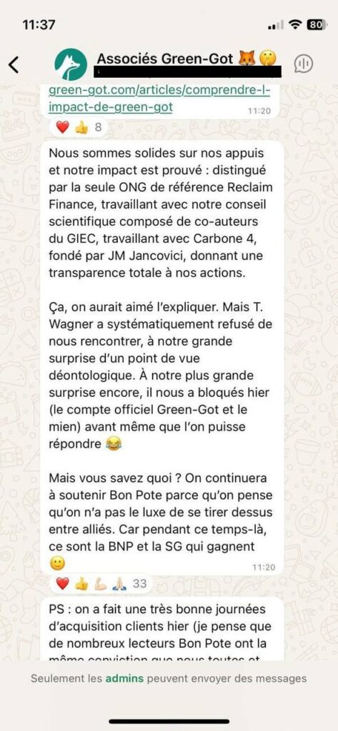 Nous nous attendions à tout type de réponse, mais vraiment pas à la réponse de Green-Got, mentionné deux fois dans notre article de 21 pages. Via sa présidente Maud Caillaux, voici le message envoyé dans une boucle whatsapp aux “Associés Green-Got” le 21 mai 2025, lendemain de la publication de notre article :