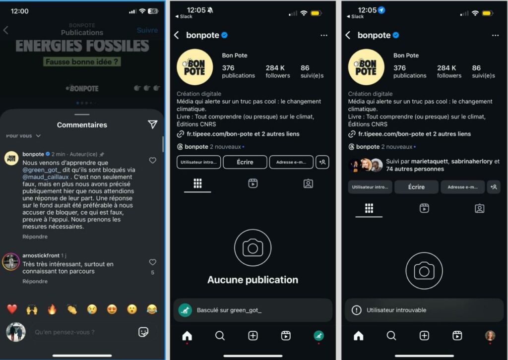2/ Tu indiques répondre point par point dans le dernier article publié aujourd’hui mais tu ne réponds pas à “T.Wagner a refusé de nous rencontrer, à notre grande surprise déontologique”. Tu n’expliques pas pourquoi tu n’as pas contacté ces acteurs en amont du premier article pour avoir leur avis cité dedans mais tu parles sur la définition du mot “bloqué” qui n’est sûrement pas le bon terme utilisé par GreenGot mais ils semblaient incapable de te joindre sur les réseaux pendant un moment vraisemblablement. À moins qu’ils aient trafiqué les captures d’écran, c’est ce que tu laisses sous entendre apparemment. Pour ma part, il m’est déjà arrivé à plusieurs reprises par le passé d’être dans l’incapacité de partager tes publications insta ou autres beug, cela serait à voir du côté de l’algo insta car c’était souvent des sujets clivants. Cela m’est arrivé pour d’autres acteurs insta de l’écologie.