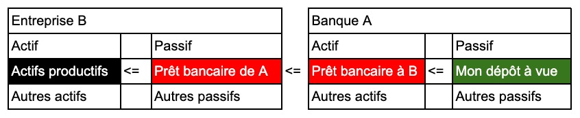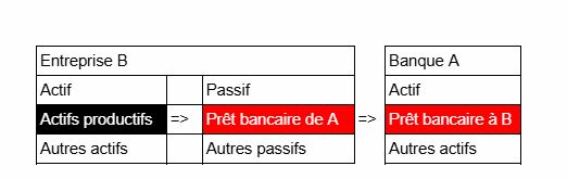 Reprenant le schéma vu plus haut, c’est bien l’entreprise B qui décide de lancer (ou pas) un projet, puis la banque A qui décide de contribuer (ou pas) au financement de cette entreprise. Votre banque ne dépend pas de votre compte à vue pour prêter à l’entreprise B puisque ab initio son actif et son passif connaissent une augmentation identique quand elle crée un nouveau prêt et donc de la nouvelle monnaie.