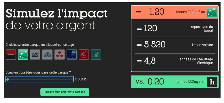 Pour moi, les banques utilisent notre argent pour financer des trucs, parfois polluant. On peut faire des indicateurs, comme la quantité de CO2 par millions d’euros investis. À partir de là, si je change de banque, pour aller vers une banque moins polluante d’après cet indicateur, j’émet moins de CO2. Si tout le monde faisait ça, total n’aurait plus de financement et ce serait chouette. Mais je n’ai pas bien compris l’explication, je passe peut etre à coté de ce qu’il faut comprendre.