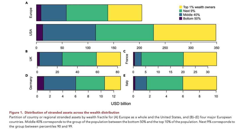 Enfin, ce sont bel et bien les plus aisés qui risquent de perdre le plus de richesses à cause d’une politique climatique ambitieuse, comme démontré par Semieniuk & al. 2023 :
