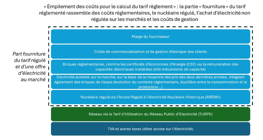 Le tarif réglementé est mis à jour chaque mois de février en empilant le coût des taxes, du réseau, de certaines briques réglementaires, du nucléaire à un prix régulé*, de la moyenne des prix de marché sur les deux dernières années et en y ajoutant des coûts de gestion d’un fournisseur avec une marge.