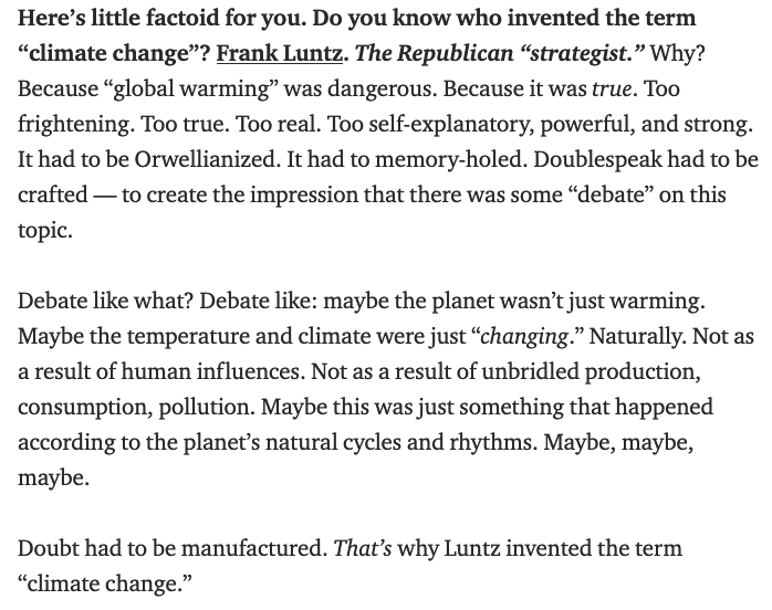 Interrogé pour Bon Pote, Jean-Baptiste Fressoz (historien des sciences, des techniques et de l’environnement) réfute cette idée : “dans les rapports américains depuis les années 1950 on utilise indifféremment d’abord “climate change » (années 50-80) ou “CO2 problem » puis global warming. Donc il est faux de dire que Luntz a inventé climate change“.