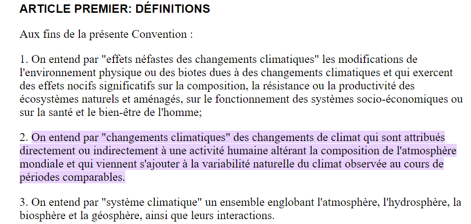 La CCNUCC établit ainsi une distinction entre les changements climatiques attribuables aux activités humaines qui altèrent la composition de l’atmosphère et la variabilité du climat imputable à des causes naturelles. Qu’est-ce que cela signifie ? Si les émissions humaines de gaz à effet de serre sont à l’origine de la tendance au réchauffement à long terme, la variabilité d’une année sur l’autre est dominée par les phénomènes comme El Niño et La Niña sur le Pacifique ou l’Oscillation Nord Atlantique qui affecte le continent européen.