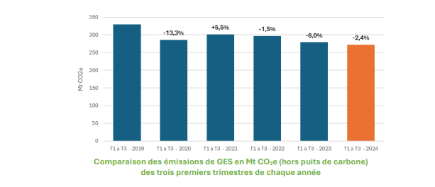 La baisse des émissions territoriales fut de plus de 5% en 2023, notamment grâce à des éléments conjoncturels favorables. En revanche, si les émissions de CO2 de la France baissent sur les trois premiers trimestres 2024, les émissions baissent deux fois moins que ce qu’il faudrait… sans compter nos forêts qui meurent et qui n’absorberont pas les émissions comme prévu.