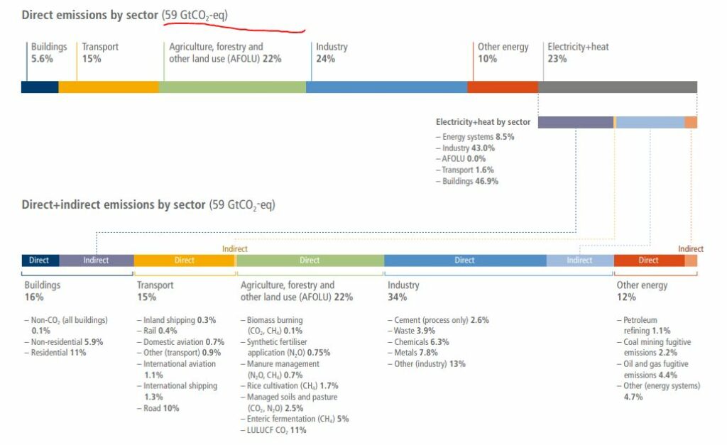 - L’agriculture et le changement d’affectation des sols, représenté par le secteur AFOLU (Agriculture, Forestry and Other Land Uses) dans les rapports du GIEC, c’est environ un quart des émissions de gaz à effet de serre (donc pas que le CO2). Pour l’année 2019, en émissions directes, le secteur représente 22% des émissions totales. Plus que les transports et la construction réunis !
