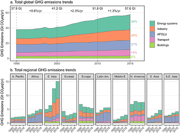 - Dans le 3e volet du dernier rapport du GIEC, on peut lire dans le résumé technique que Le secteur AFOLU a représenté en moyenne 13 à 21 % des émissions anthropiques totales de gaz à effet de serre dans le monde au cours de la période 2010-2019.