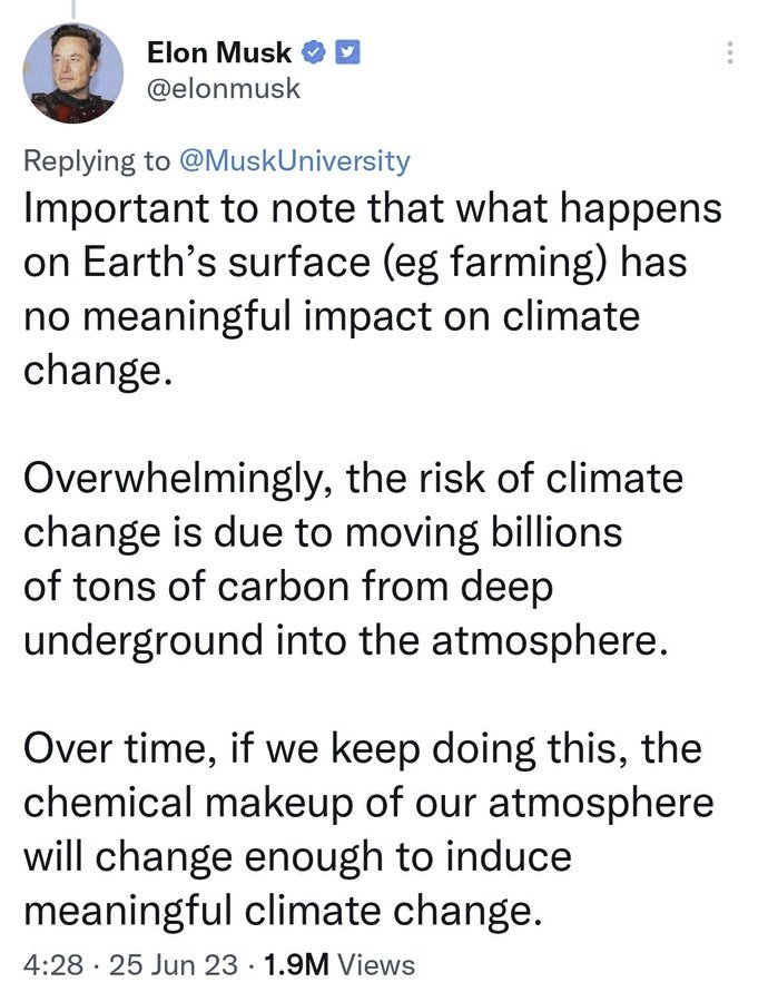 personnellement je trouve plus didactique de dire “Musk reconnaît et craint la cause no 1 du désastre climatique, cependant il sous-estime les autres causes (par ex le changement d’affectation des sols) et problèmes (par ex l’extraction, la biodiversité) du désastre en cours”