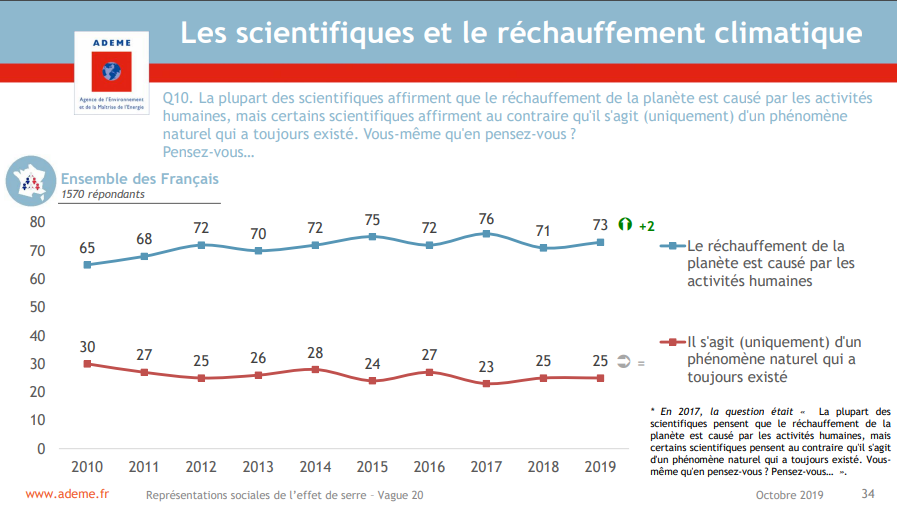 3) The difference between science and opinion: despite multiple studies proving anthropogenic global warming, a gap remains between the expert consensus (99%+) and public opinion. In France, a 2019 poll conducted by the ADEME (Environmental and Energy Management Agency) showed that 25% of French people still think that global warming is only a natural phenomenon that has always existed… However, a press article or an interview will never have the scientific value of a peer-reviewed article.