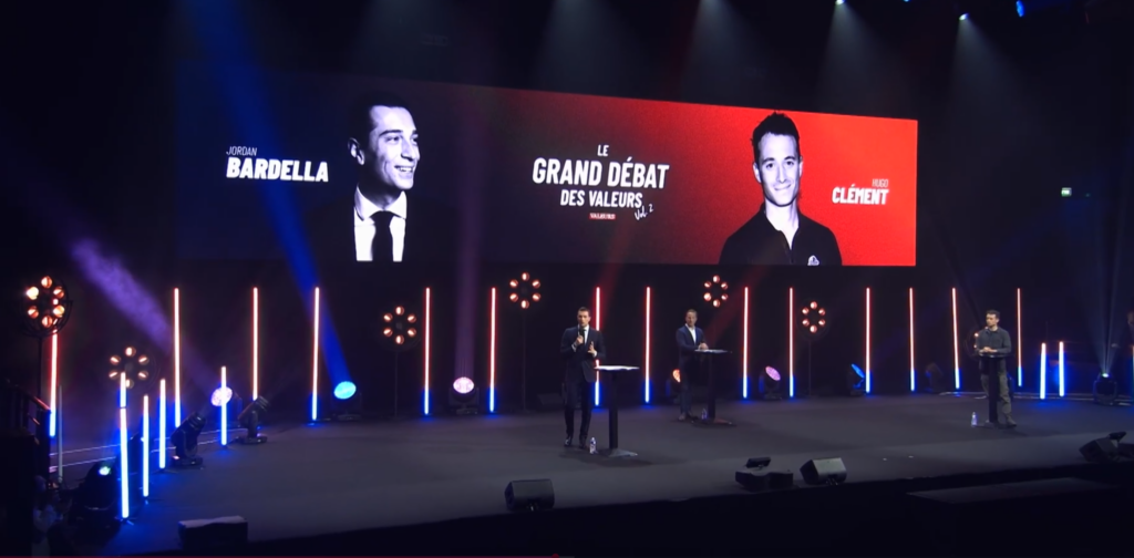 Dans notre article, « débattre avec l’extrême droite » désignera le fait d’argumenter en public avec des personnalités, des responsables politiques ou des leaders d’opinions d’extrême droite. Parler en privé avec votre voisin ou votre cousin assumant des idées d’extrême droite n’a pas du tout les mêmes implications, ce sera un autre sujet. Et, bien sûr, chaque contexte particulier a un impact sur notre sujet : un débat mené lors d’un événement conçu par un journal condamné pour injure raciste – comme c’était le cas pour Hugo Clément chez Valeurs actuelles – n’a pas le même impact qu’un simple échange sur un plateau TV. Les débats menés en 2002 alors que l’extrême droite était une force politique a priori minoritaire n’ont pas la même incidence que ceux réalisés en 2026 alors que c’est le premier groupe à l’Assemblée nationale.