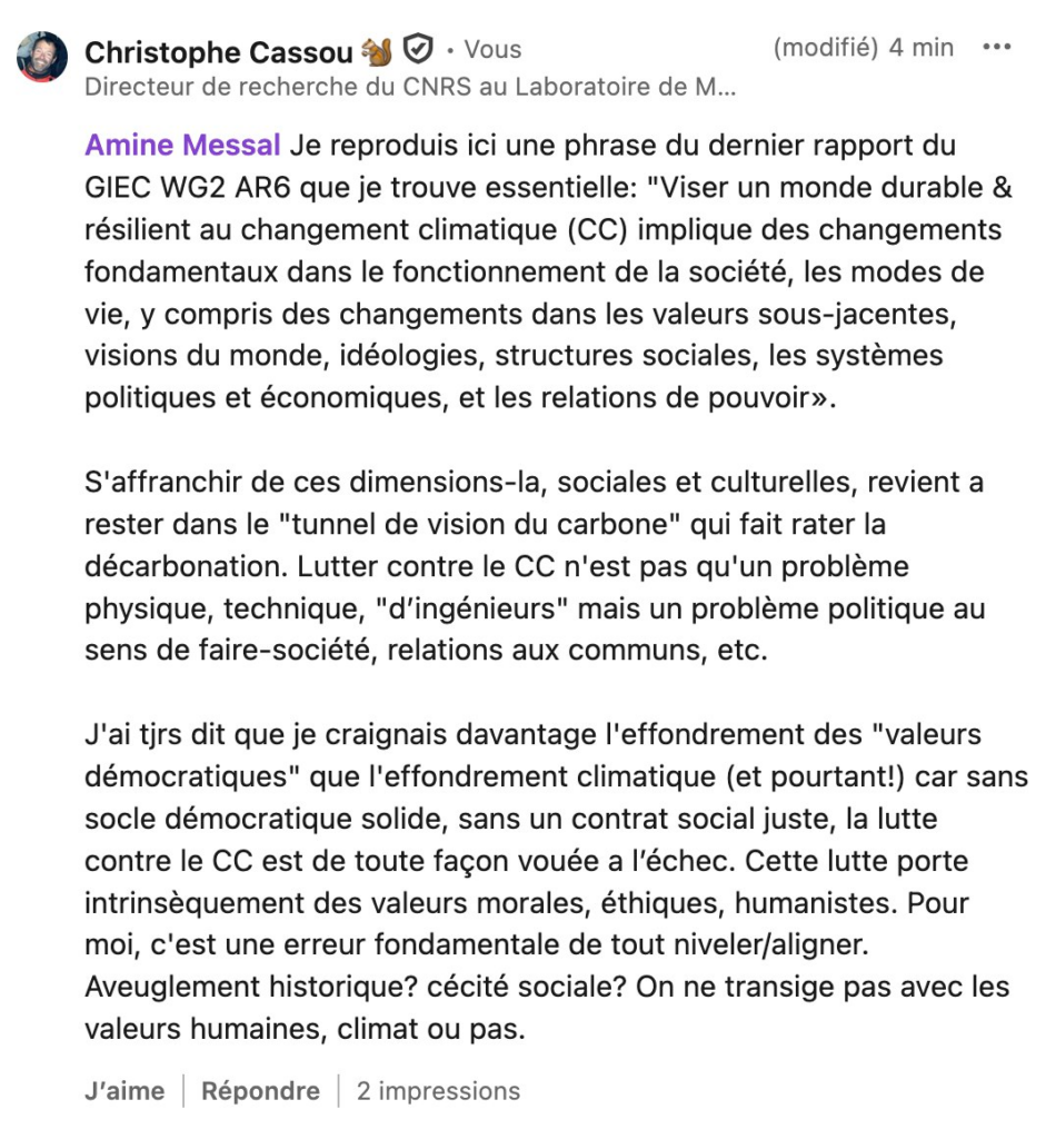 Cette position a été partagée par plusieurs auteurs et autrices du Giec, qui se sont exprimées sur Linkedin au cours de ces débats. C’est notamment le cas de Christophe Cassou et Yamina Saheb :