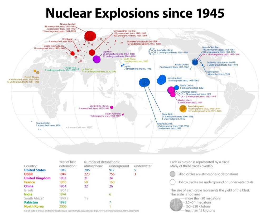 [0]: La valeur 2.1 x 10^18 J vient de https://fr.wikipedia.org/wiki/Puissance_des_armes_nucl%C3%A9aires#Exemples, qui cite un bouquin de 1996 qui évaluait l’énergie cumulée sur 1945-1996 à 510 000 ktTNT. Or 1 ktTNT = 4.2 TJ = 4.2 x 10^12, d’où la valeur. L’article cite plutôt 540 Mt, donc j’ai rehaussé proportionnellement : 2.1 x 540 / 510 = 2.22.