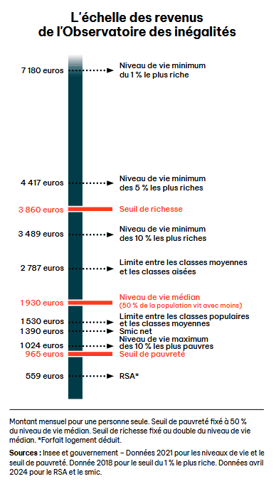 En France, selon l’observatoire des inégalités, avec 3 489€ par mois, vous faites partie des 10% des plus hauts revenus. Avec 4 417€ par mois vous faites partie des 5%, et à partir de 7 180€ par mois, des 1% des plus hauts revenus.