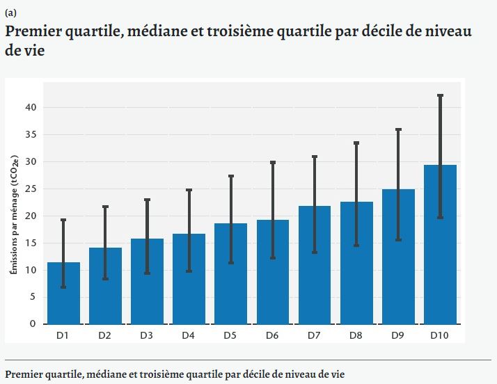 Il est possible qu’une personne gagnant 10 000€ par mois ait un mode de vie plus sobre qu’une personne au SMIC. Pottier & al. (2020) constatent même que les ménages du quart le plus émetteur du D1 (10% plus pauvres) émettent plus que les ménages du quart le moins émetteur du D10 (10% plus riches).