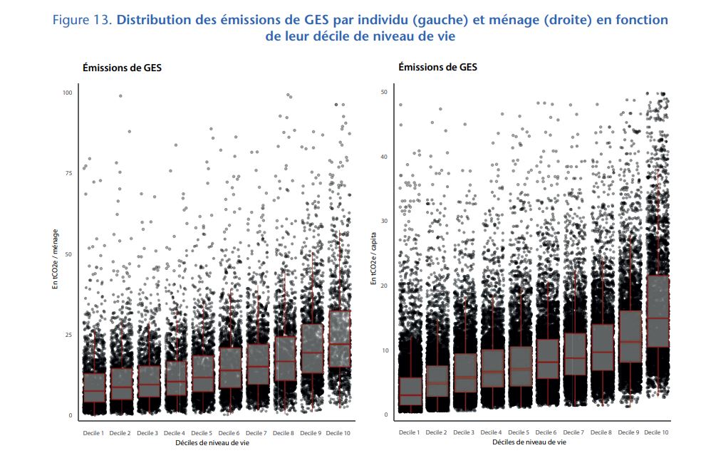 En comparant les niveaux de vie, nous observons que les 10% les plus riches gagnent en moyenne 9 fois plus d’argent que les 10% les plus pauvres. En revanche, leurs émissions sont seulement 2 à 3 fois plus importantes.