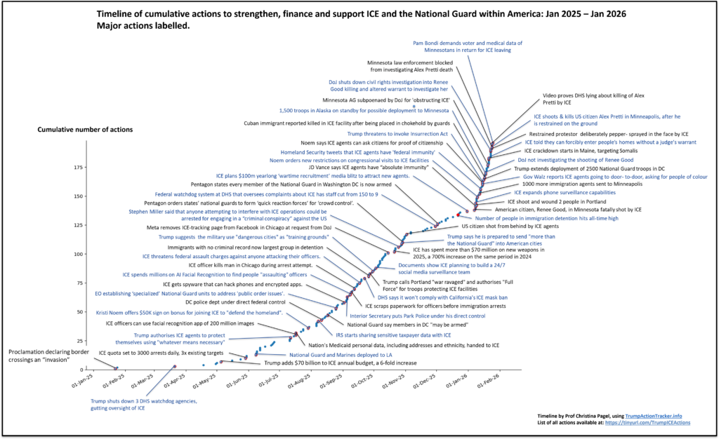 Cette dynamique mortifère ne fait que prendre de l’ampleur. La chercheuse Christina Pagel (University College London) montre qu’au cours de l’année qui vient s’écouler, l’administration Trump n’a eu de cesse d’alimenter la “tempête ICE” en augmentant les financements et les capacités de cette police spéciale, en “normalisant la rhétorique violente et raciste”, et en “élargissant le soutien juridique à l’application de la loi sur l’immigration”.