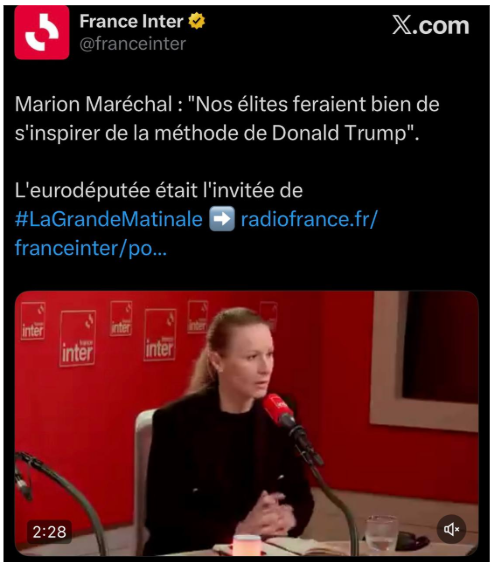 Dans la sphère de l’extrême droite, on a pu entendre Marion Maréchal au micro de France Inter relativiser la gravité des faits en évoquant, au sujet d’Alex Pretti, un simple “incident”.