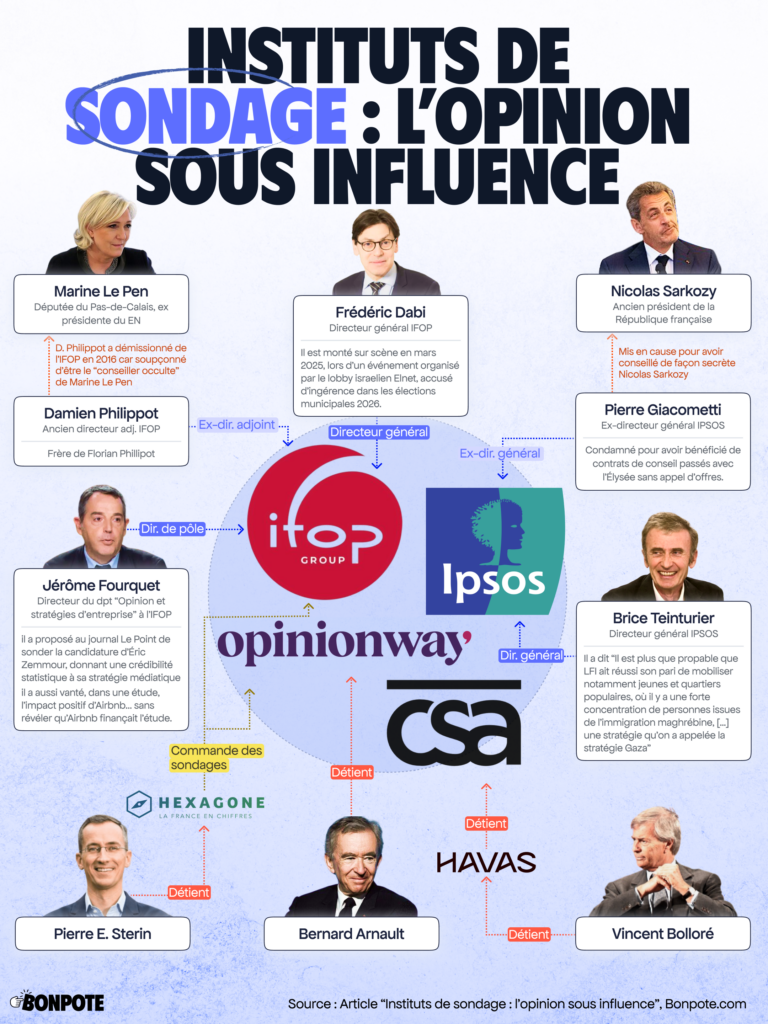 - OpinionWay est détenu par le groupe les Echos-Le Parisien, une filiale de LVMH propriété du milliardaire Bernard Arnault. Ce dernier est souvent qualifié d’ultra-libéral mais sa radicalisation vers l’extrême droite a été décrite avec précision au moment de sa campagne contre la taxe Zucman, ou lorsqu’il a fait la promotion du dirigeant fasciste américain Donald Trump, au retour de l’investiture de ce dernier.