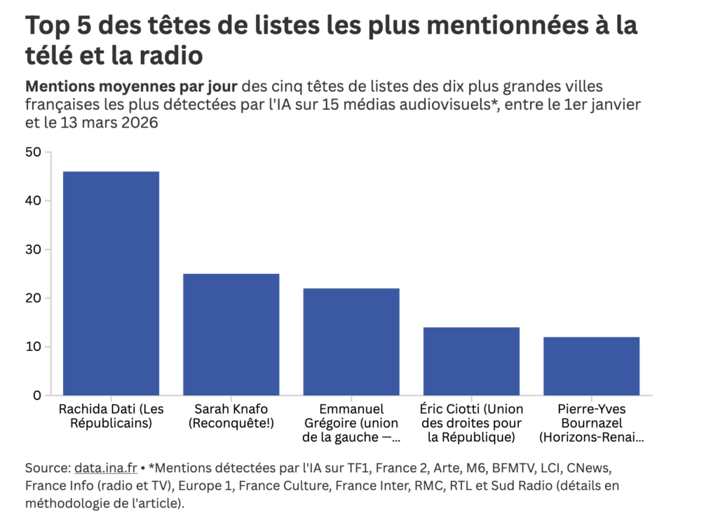 Ces faits dépassent bien sûr la seule responsabilité des instituts, puisque rien n’oblige les médias à s’engouffrer autant dans ce genre de bulles. Et, pourtant, ils le font. Ainsi, la Revue des médias de l’INA a publié une étude montrant que, lors des municipales 2026, plusieurs candidats et candidates d’extrême droite ont bénéficié d’une couverture médiatique a priori démesurée, dont la candidate et membre de Reconquête Sarah Knafo. Elle est la deuxième candidate la plus citée du pays, et ce n’est pas seulement la responsabilité des instituts de sondage.