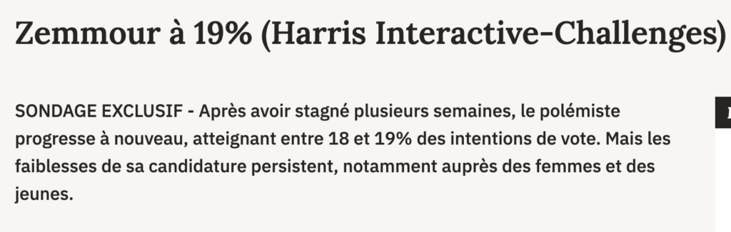 Challenges titrait en novembre 2021 un article consacré au sondage mené sur Internet et commandé chez Harris Interactive : « Zemmour à 19% » et le directeur des études Jean-Daniel Lévy y affirmait : « Notre étude montre que les deux principaux opposants à Emmanuel Macron sont Eric Zemmour et Marine Le Pen et non plus la droite ».
