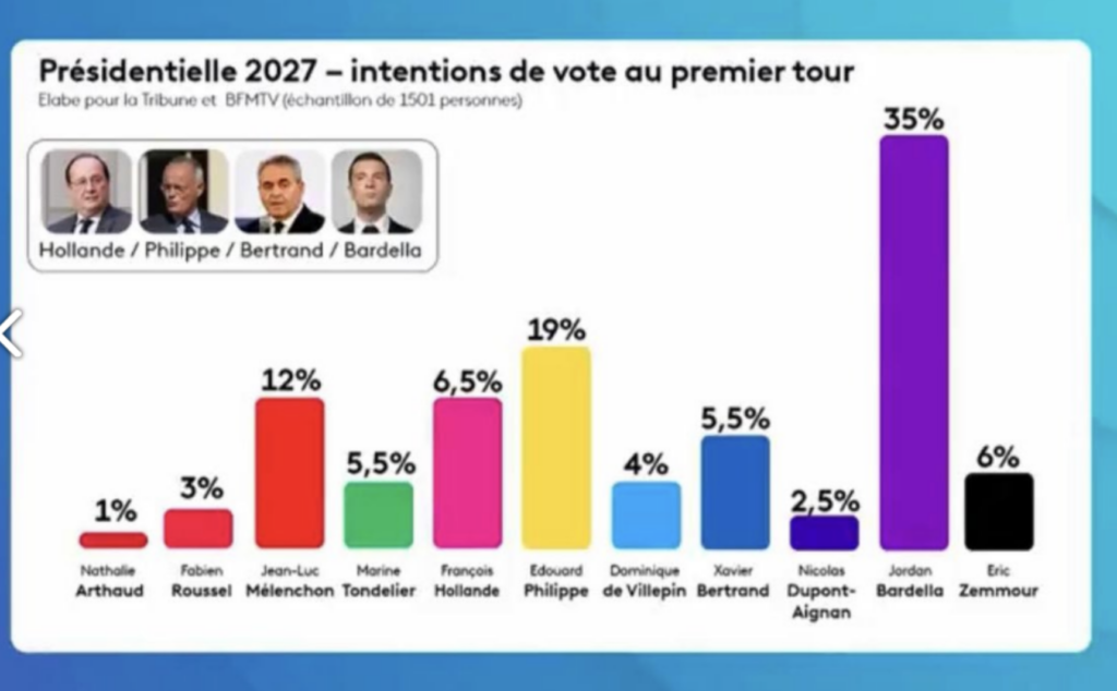 Et on ne parle même pas des erreurs et approximations souvent diffusées par les médias à propos des sondages. Un seul exemple : en novembre dernier, France info a réalisé une infographie au sujet de la présidentielle de 2027. François Hollande et Jean-Luc Mélenchon étaient crédités d’une barre d’histogramme visuellement aussi grande, alors que le premier avait deux fois moins d’intentions de vote.