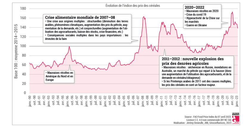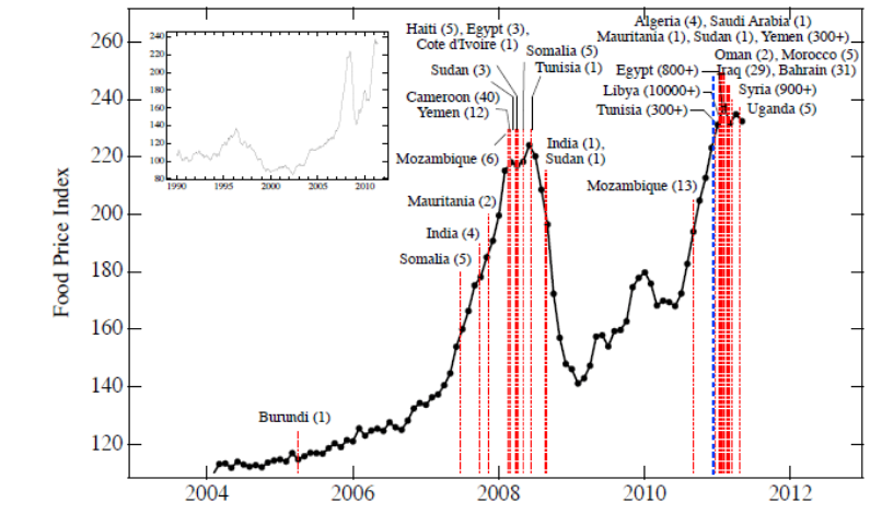 Six mois avant le début des révolutions arabes, à l’été 2010, les cultures de blé en Russie et Ukraine subissent des sécheresses historiques et, dans le même temps, des pluies diluviennes touchent l’Australie, qui diminue drastiquement sa production. Résultat : une baisse de 30% de la production s’observe à travers le monde, accompagnée d’un doublement du prix à la tonne du blé (157$ en juin 2010 à 326$ en février 2011), principal céréale consommée.