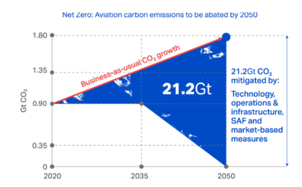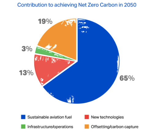 Cette prédiction, l’Association internationale du transport aérien (IATA) s’y est risquée en 2021 dans un document : « Net zero carbon 2050 résolution ». On peut y lire la répartition des postes qu’elle propose afin de respecter la promesse de neutralité carbone du secteur en 2050 :