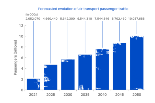 5%, cela peut paraître peu, mais les prévisions de croissance du traffic mondial font froid dans le dos : x 2,5 d’ici à 2050, c’est-à-dire demain. Ceci dans un contexte paradoxal d’objectif de neutralité carbone souhaité par l’Organisation de l’aviation civile internationale (OACI) à l’horizon 2050. Paradoxal, car l’incorporation de SAF dans le mix de carburant pourrait bien en réalité ne pas compenser l’augmentation prévue du nombre d’avions (x 2 à l’horizon 2041 selon Airbus).