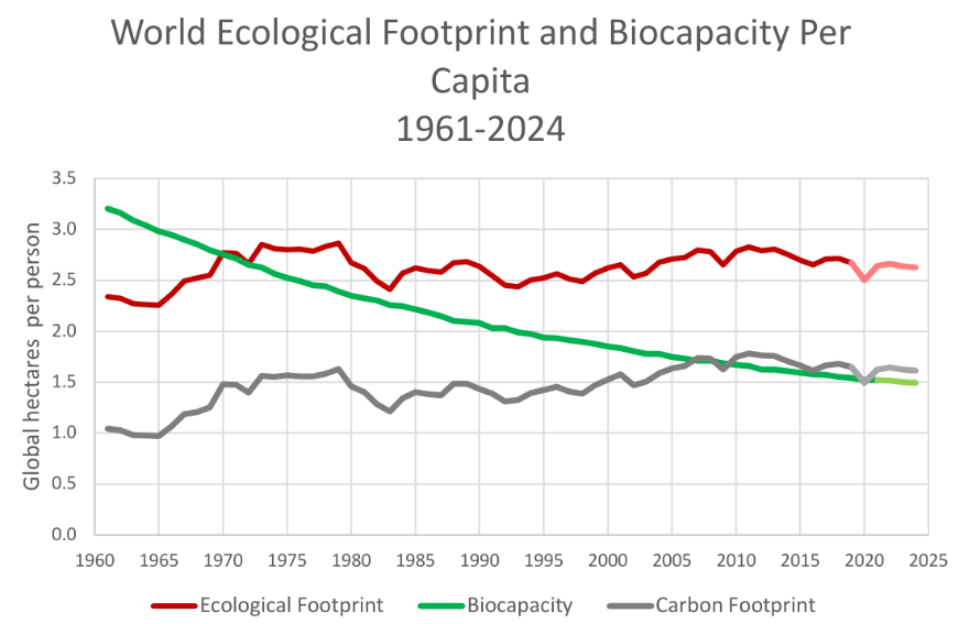 En effet, la production des milieux naturels est rapportée à une surface exploitable de 12 milliards d’hectares qui n’a que peu augmenté, résultant en une biocapacité par personne (1,5 hectares) qui diminue en raison de l’augmentation de la population.