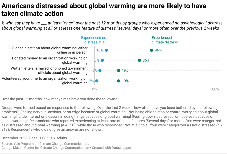 Car en effet, l’éco-anxiété ou la colère climatique semble bien être un tremplin à l’engagement pour les causes environnementales. Dans une étude conduite en 2022 par l’université de Yale, les personnes qui exprimaient un sentiment de détresse climatique (près de 10% de l’échantillon d’étude, en gardant en tête que cette proportion est très dépendante de la formulation de la question posée) rapportaient bien plus fréquemment être passées à l’action pour la cause climatique, de la signature de pétition à l’investissement personnel dans des organisations environnementales.