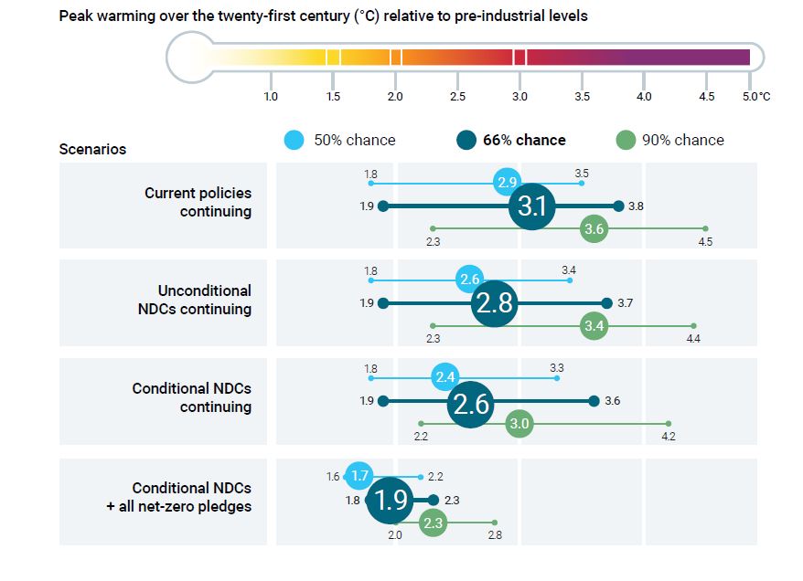 La réalité : l’objectif +1.5°C est mort, mais nous le savions “officiellement” depuis le sixième rapport du GIEC sorti en 2021. L’objectif de rester sous la barre des +2°C est encore atteignable mais il est illusoire de penser que nous y parviendrons sans changement radical de nos économies. Rappelons-le si ce n’était pas clair : les promesses actuelles nous emmènent vers un monde en partie inhabitable de +3°C.
