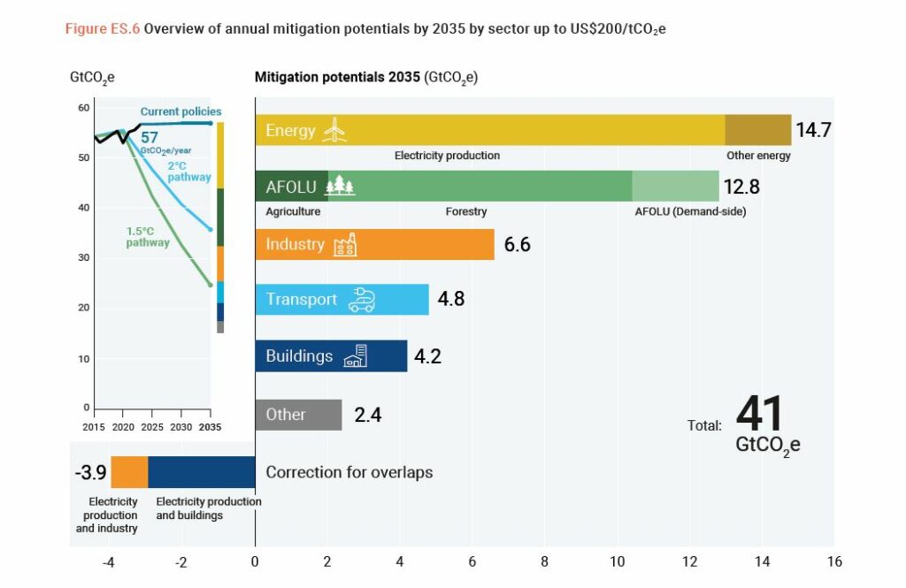 L’un des chapitres du rapport est consacré aux solutions. Le secteur de l’énergie présente le plus grand potentiel de décarbonisation à faible coût, avec 12 GtCO2e/an en 2030 et 15 GtCO2e/an en 2035, en grande partie grâce au remplacement de la production d’électricité à partir de combustibles fossiles par des sources d’énergie propres.