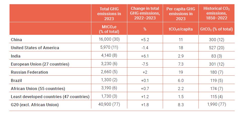 L’augmentation des émissions totales de gaz à effet de serre (GES) de 1,3 % par rapport aux niveaux de 2022 est supérieure au taux moyen de la décennie précédant la pandémie de COVID-19 (2010-2019), au cours de laquelle la croissance des émissions de GES a été en moyenne de 0,8 % par an.