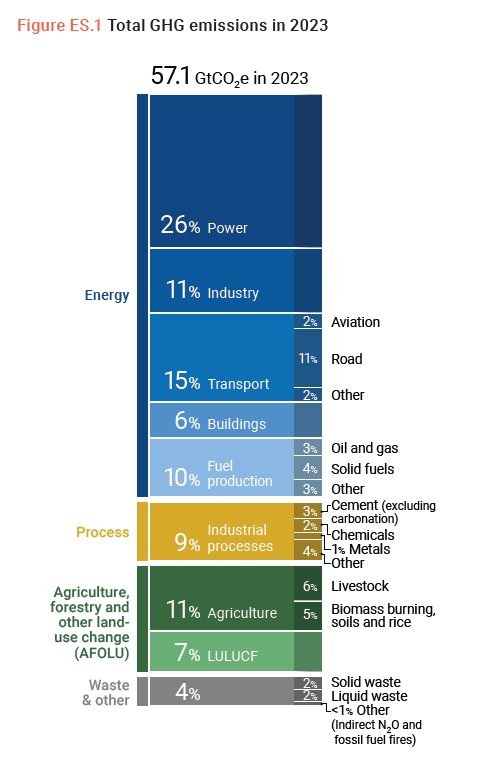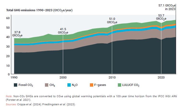 “No more hot air…please!” C’est le titre de la 15e édition du Emissions Gap Report. Premièrement, l’année 2023 est une année record pour les émissions mondiales de gaz à effet de serre, qui atteignent 57,1 gigatonnes de CO2eq.