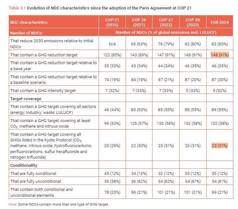 Le rapport montre que 91 % des émissions mondiales sont couvertes par une CDN assortie d’un objectif de réduction des GES. En revanche, seulement 23 engagements couvrent tous les gaz à effet de serre (qui ne se limitent pas qu’au CO2 !)
