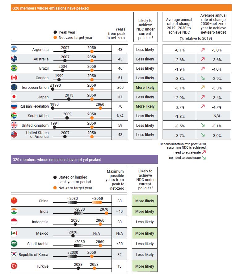De nouveaux graphiques sont disponibles, dont le tableau ci-dessous qui donne des informations sur les pays membres du G20 et les chances qu’ils ont de respecter leurs engagements climatiques. Comme d’habitude, si les chiffres sont indiscutables, les interprétations peuvent grandement varier…