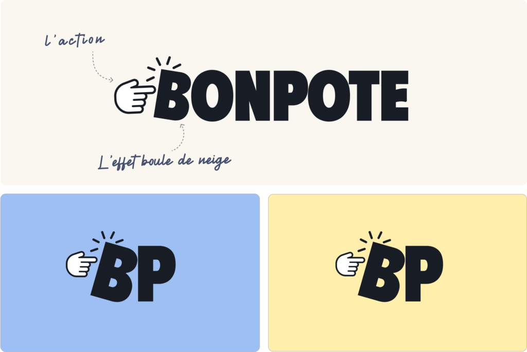- Un doigt qui touche le “B” de Bon Pote, symbolise l’action et l’importance d’être dans l’action. C’est l’étincelle avant l’incendie, la goutte d’eau qui fait déborder le vase, mais dans le bon sens.