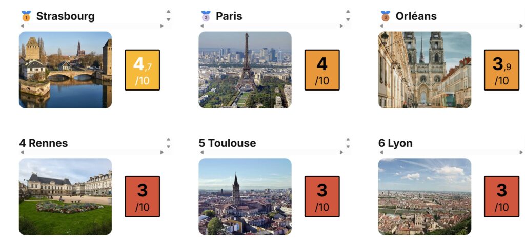 Quelque chose saute aux yeux : les chiffres ne sont pas glorieux. En mai 2023, le meilleur élève français est sans surprise Strasbourg et sa métropole, mais son score de 3,7 / 10 donne la couleur du reste du classement.