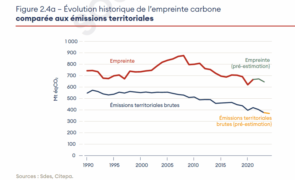 En revanche, l’empreinte carbone doit drastiquement chuter, pour diminuer de 80% par rapport à 2005. Notez que les émissions du transport aérien international (comptabilisées en dehors des émissions territoriales) continuent d’augmenter rapidement, tout comme les émissions du transport maritime international, en très forte hausse en 2024, après une baisse en 2023.