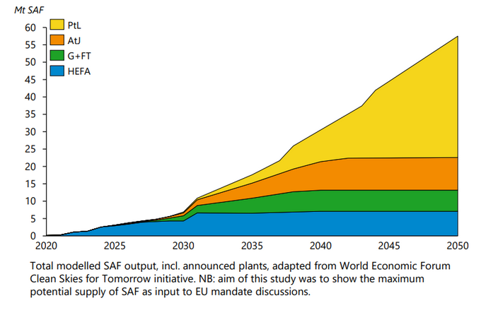 C’est LE grand espoir du secteur. Ci-dessous les prévisions de SkyNRG (producteur de SAF) pour le marché européen à l’horizon 2050. Les e-fuels (PtL) se taillent la part du lion